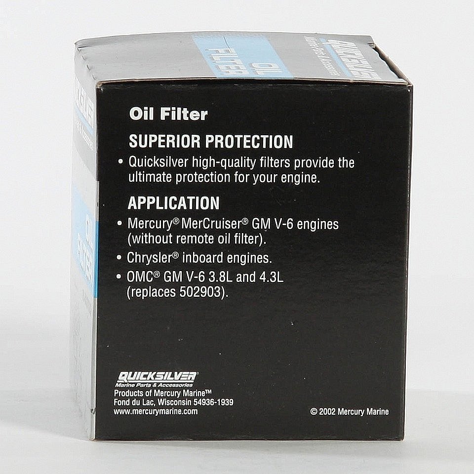 Tillverkarens text: Fits MCM V‑6 models that have the oil filter mounted on the engine block. Not for use with V‑6 engines that have a remote oil filter. This engineered marine filter provides outstanding durability through a more robust design, heavier gauge materials and a superior paint process inside and out. Designed for a marine environment, this filter provides benefits not found in a standard automotive filter.