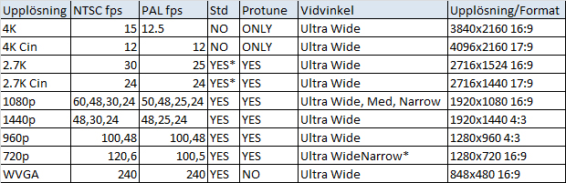 • Professionell 4kp15, 2.7Kp30, 1440p48, 1080p60, 960p100, 720p120 fps videokvalitet